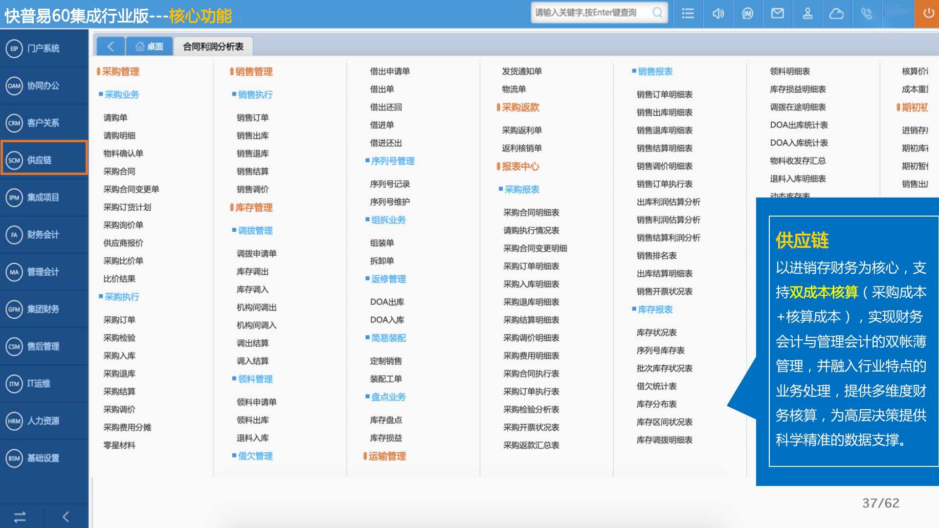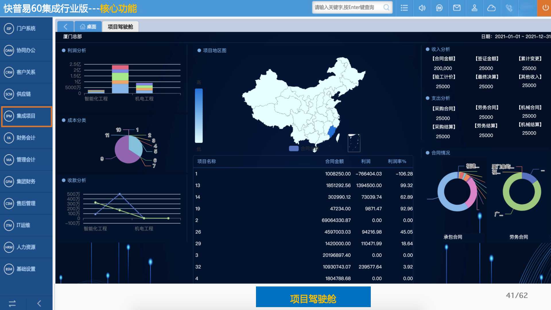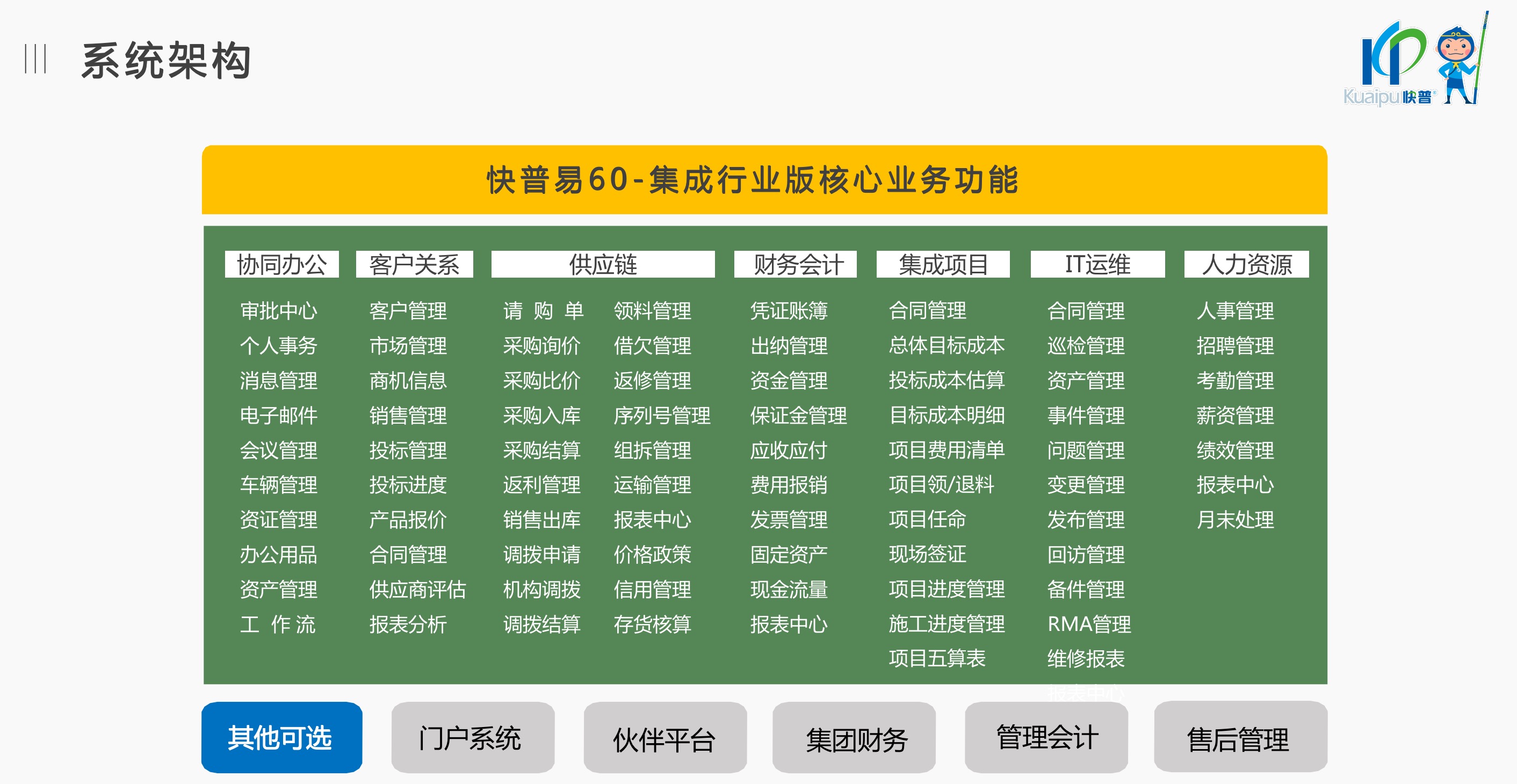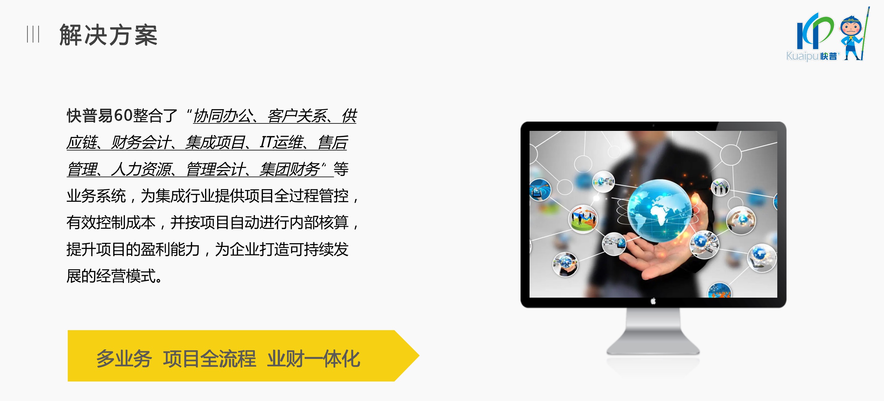 快普易60以客戶為目標(biāo)、以項目為核心,為集成行業(yè)提供數(shù)字化管理解決方案,為組織和業(yè)務(wù)提效,實現(xiàn)項目全過程管控,有效控制成本,并按項目自動進(jìn)行內(nèi)部核算,提升項目的盈利能力,為企業(yè)打造可持續(xù)發(fā)展的經(jīng)營模式。