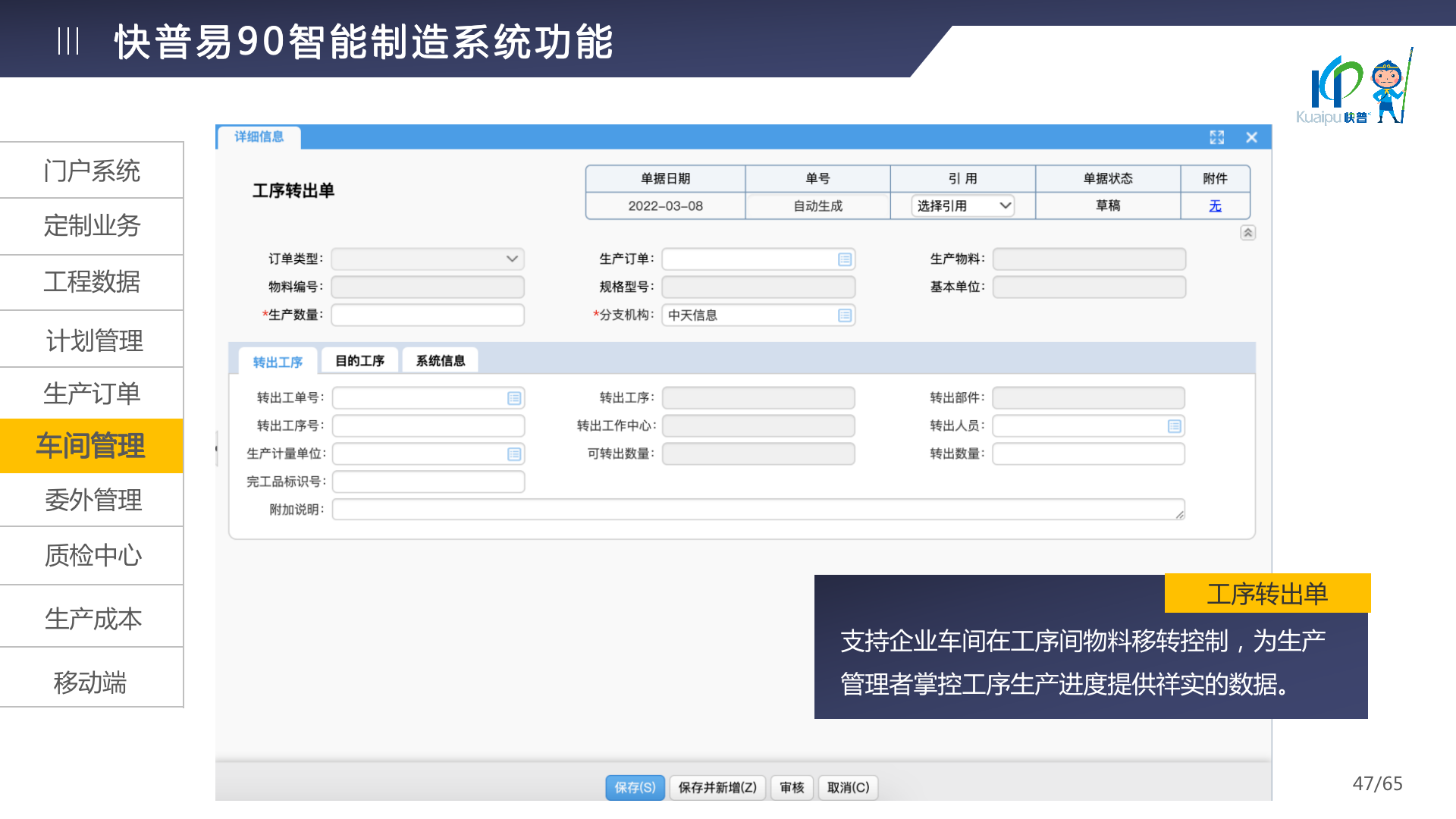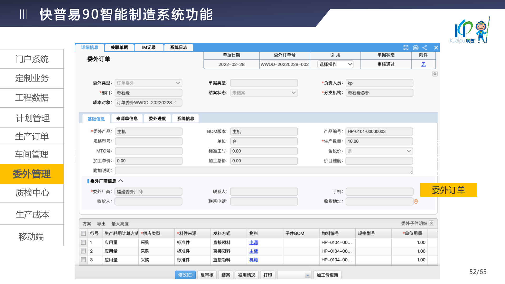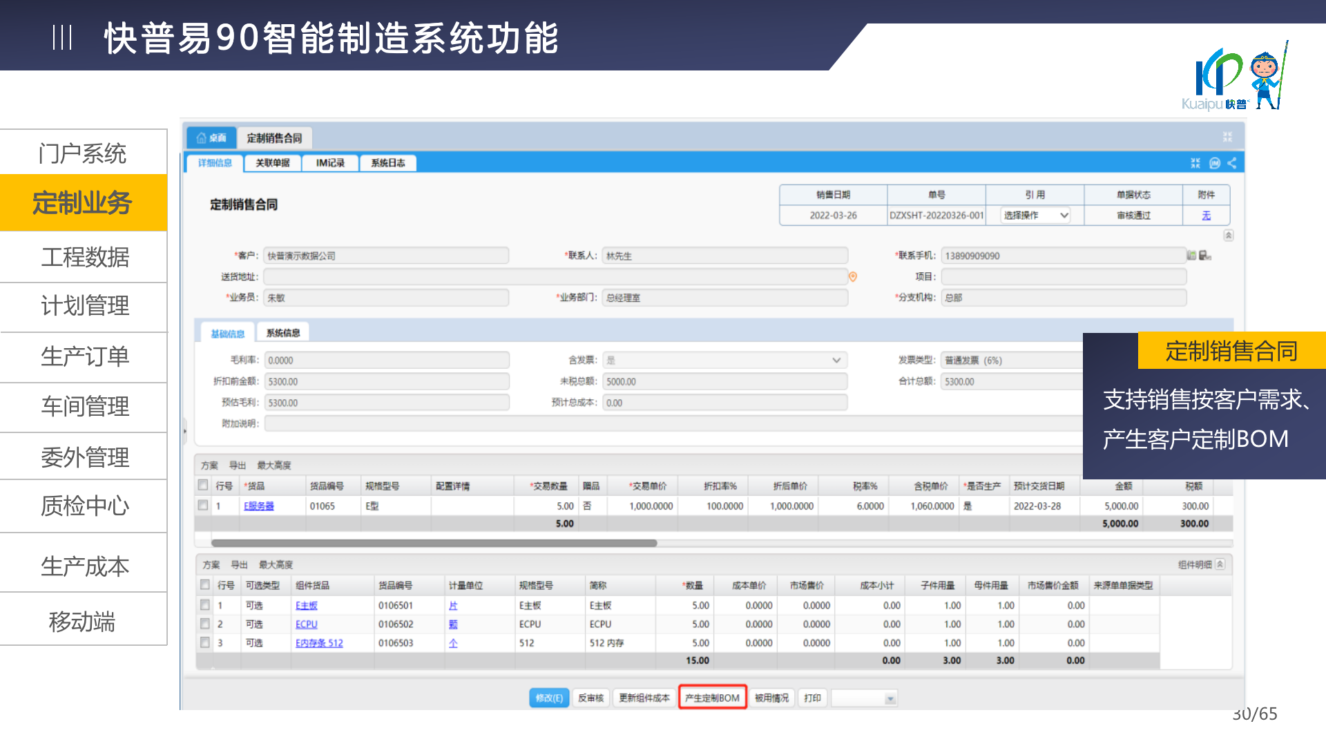 快普易90融合了大量精益生產(chǎn)管理的經(jīng)驗,涵蓋計劃管理、BOM管理、MRP運算、生產(chǎn)訂單管理、供應(yīng)鏈管理、車間管理、出入庫管理、委外管理、質(zhì)量管理、生產(chǎn)成本核算、報表分析等全面生產(chǎn)管理,為企業(yè)打造實時感知變化、分析變化、提供決策的數(shù)字化管理平臺,推動企業(yè)創(chuàng)新的管理,實現(xiàn)“智能制造”的數(shù)字化轉(zhuǎn)型。