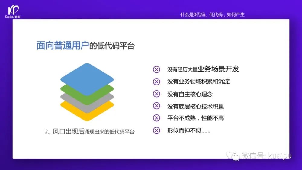 “這兩年快普已經(jīng)成功轉(zhuǎn)型為數(shù)字化平臺(tái)服務(wù)商,為客戶提供開(kāi)發(fā)平臺(tái)和解決方案(產(chǎn)品)等服務(wù)。我們先從開(kāi)發(fā)平臺(tái)說(shuō)起,目前市場(chǎng)上的零代碼、低代碼平臺(tái)大致可以分為這幾類: