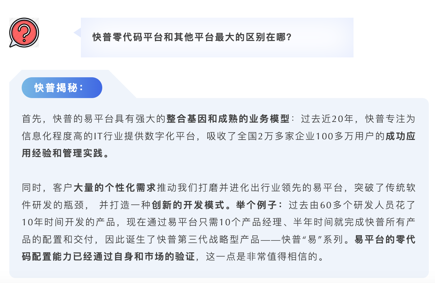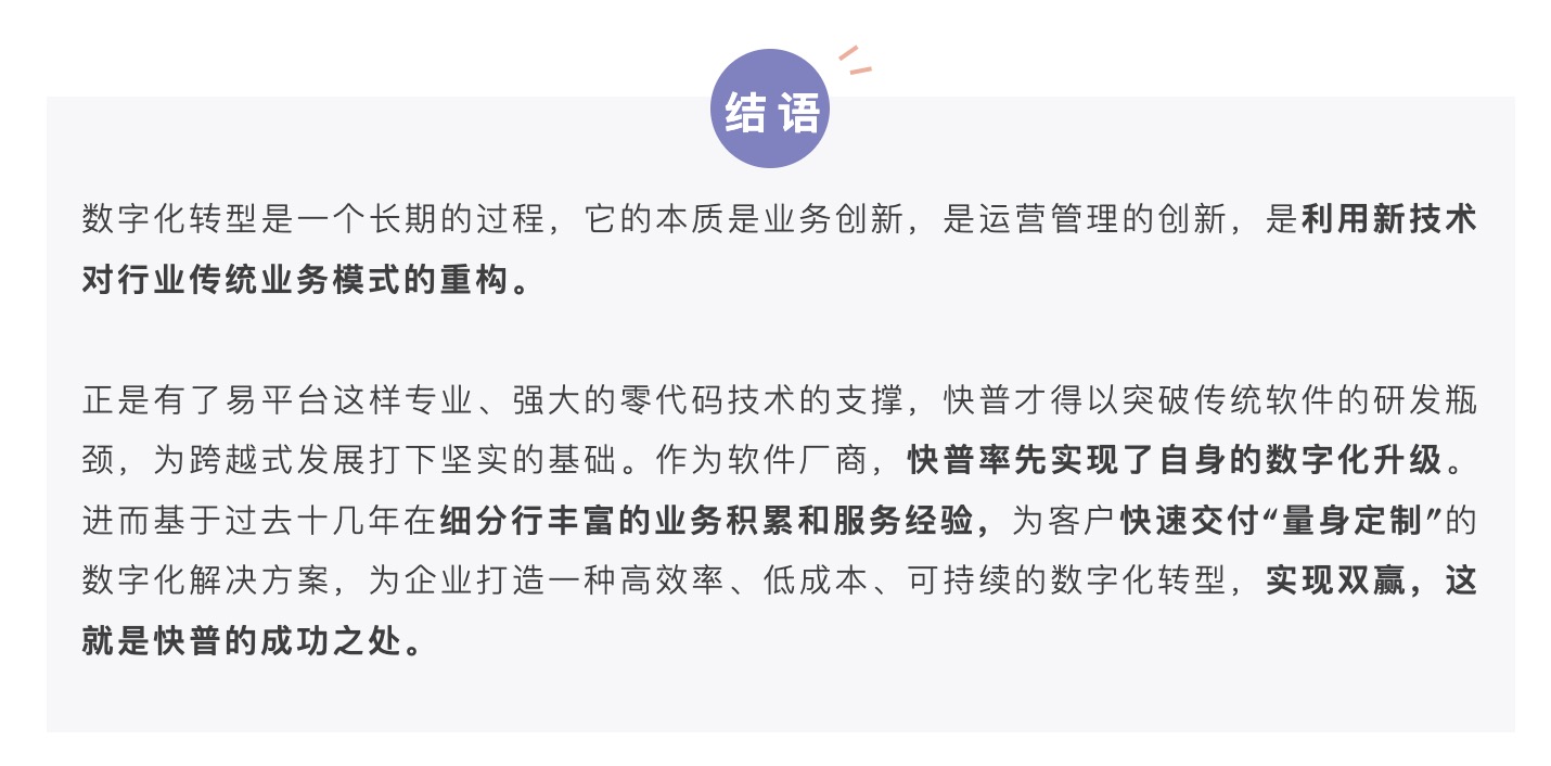 是的,我們可以很自信地說(shuō)“快普零代碼平臺(tái)讓數(shù)字化轉(zhuǎn)型變得簡(jiǎn)單、可行”。這個(gè)是面對(duì)數(shù)字化轉(zhuǎn)型的所有角色而言的,包括我們自身軟件研發(fā)、實(shí)施交付,以及合作伙伴、用戶等,易平臺(tái)在效率、成本、技術(shù)門(mén)檻和可擴(kuò)展性等方面來(lái)說(shuō)都有著顛覆性的突破,是非常有意義和必要的基礎(chǔ)設(shè)施??偨Y(jié)說(shuō)有下面幾點(diǎn):