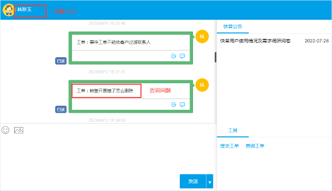 方法一、 通過會話窗口右邊“查詢工單”即可查看所有提交過的問題
