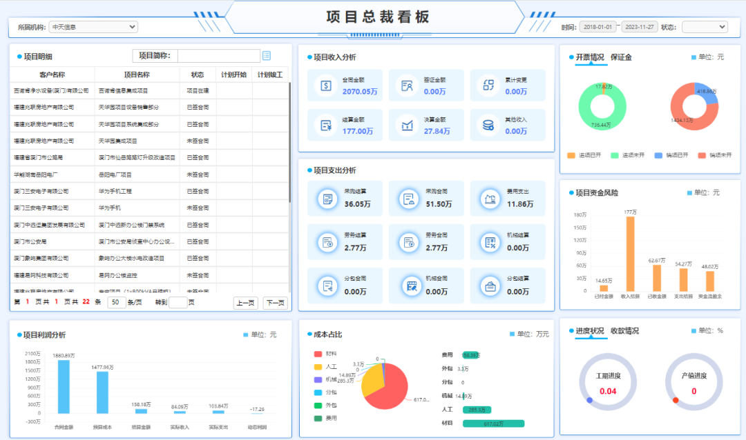 1、智慧決策體系:構(gòu)建涵蓋項(xiàng)目毛利率、質(zhì)保金狀態(tài)等項(xiàng)目關(guān)鍵指標(biāo)的多維度數(shù)據(jù)看板,支持管理層與執(zhí)行層分級(jí)透視。
