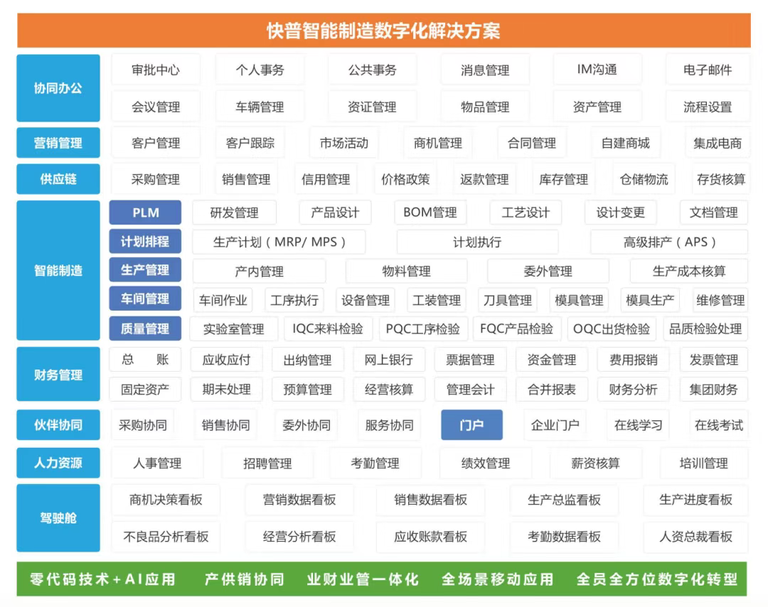快普智能制造數字化解決方案整合了12大系統(tǒng),全面覆蓋華達環(huán)衛(wèi)的管理需求,為其提供協(xié)同辦公、客戶關系、供應鏈、財務會計、智能制造(含研發(fā)PLM、MRP、APS、生產、車間、質量等管理)、售后管理、伙伴平臺、租賃管理、人力資源等一站式管理。