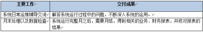 該階段主要是做系統(tǒng)開賬運作之后,持續(xù)支持運用中出現(xiàn)的所有問題,系統(tǒng)運行完整月之后,指導(dǎo)月結(jié),得到相關(guān)的報表數(shù)據(jù)。該階段結(jié)束以《持續(xù)支持里程碑確認單》作為交付。