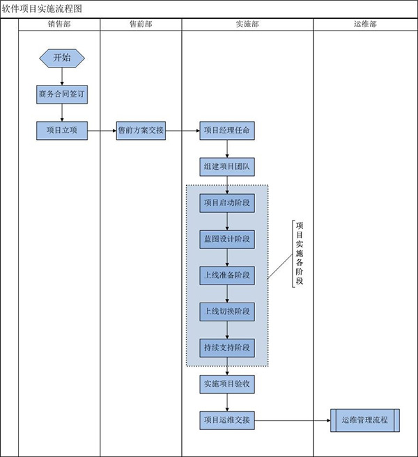 快普軟件項目實施分為五個階段:項目啟動階段、藍圖設(shè)計階段、上線準備階段、上線切換階段、持續(xù)支持階段。每個階段都有對應(yīng)的階段交付成果。完成這五個階段的任務(wù)之后,進入實施項目驗收階段。實施驗收完成之后,轉(zhuǎn)入運維部門,實施過程結(jié)束。