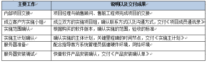 該階段主要是做實施基礎(chǔ)的搭建,包括完成內(nèi)部交接、確認雙方的項目組成員名單、確認實施范圍、確認實施計劃、服務(wù)器準備以及軟件部署。該階段結(jié)束以《項目啟動階段里程碑確認單》作為交付。